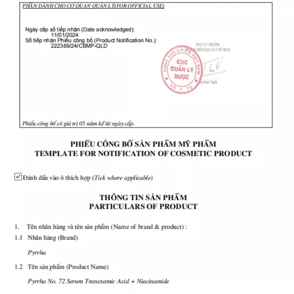 Pyrrha No. 72 – Serum Tranexamic Acid + Niacinamide Tinh chất làm mờ thâm mụn, nám và đều màu da chuyên sâu